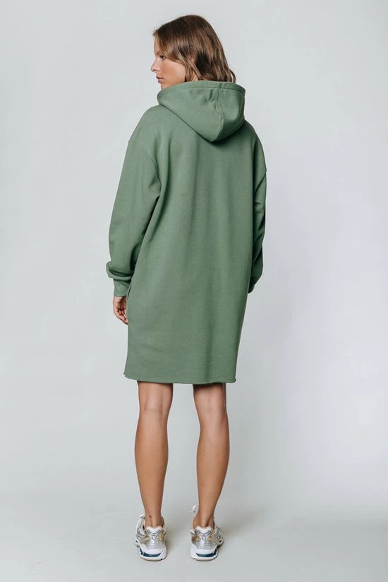 Sweat jurkOversized fitRegular lengteLange mouw88% organisch katoen, 12% polyesterNon stretch stofBinnenstebuiten machinewas 30°, niet in de droger, strijken of stomen op lichte temperatuur, niet bleken, wassen met gelijke kleurenModel is 1.77m en draagt S