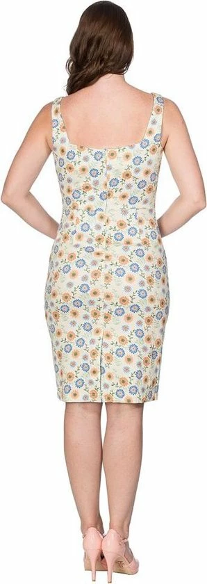 Dancing Days. Deze kokerjurk met sweetheart halslijn heeft een jaren 70 geïnspireerde bloemen print.