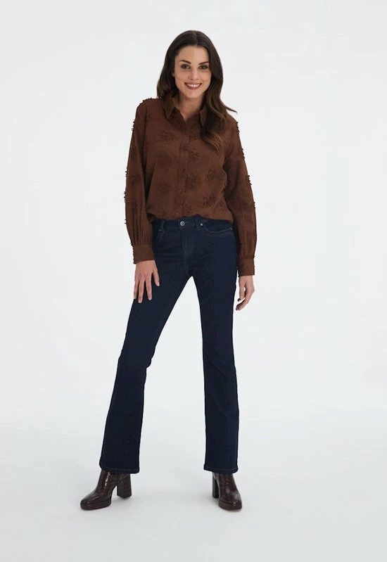 Flared jeans van Red Button. Dit 5-pocket model heeft een stoere stone wassing. De jeans heeft een regular taille en sluit met een knoop,- rits combinatie